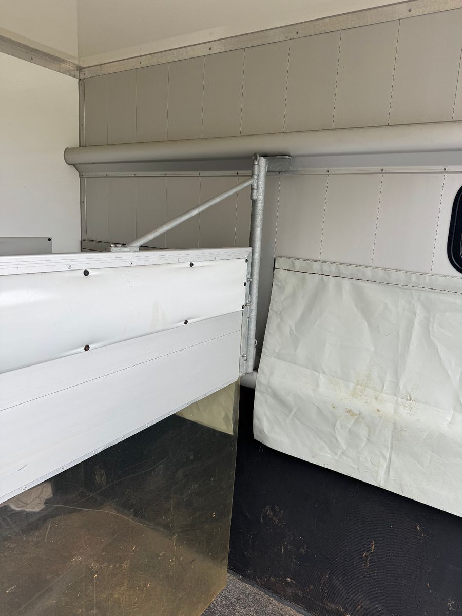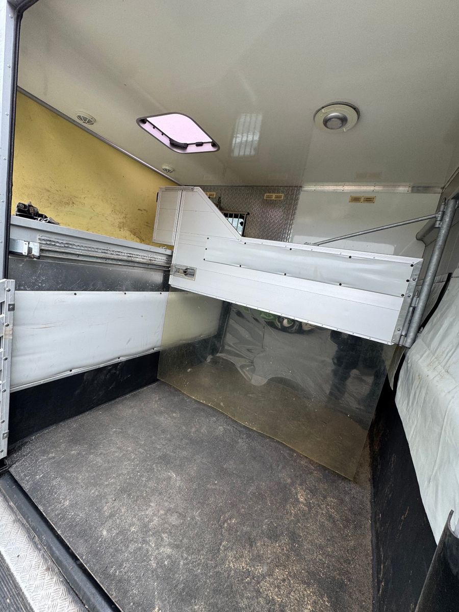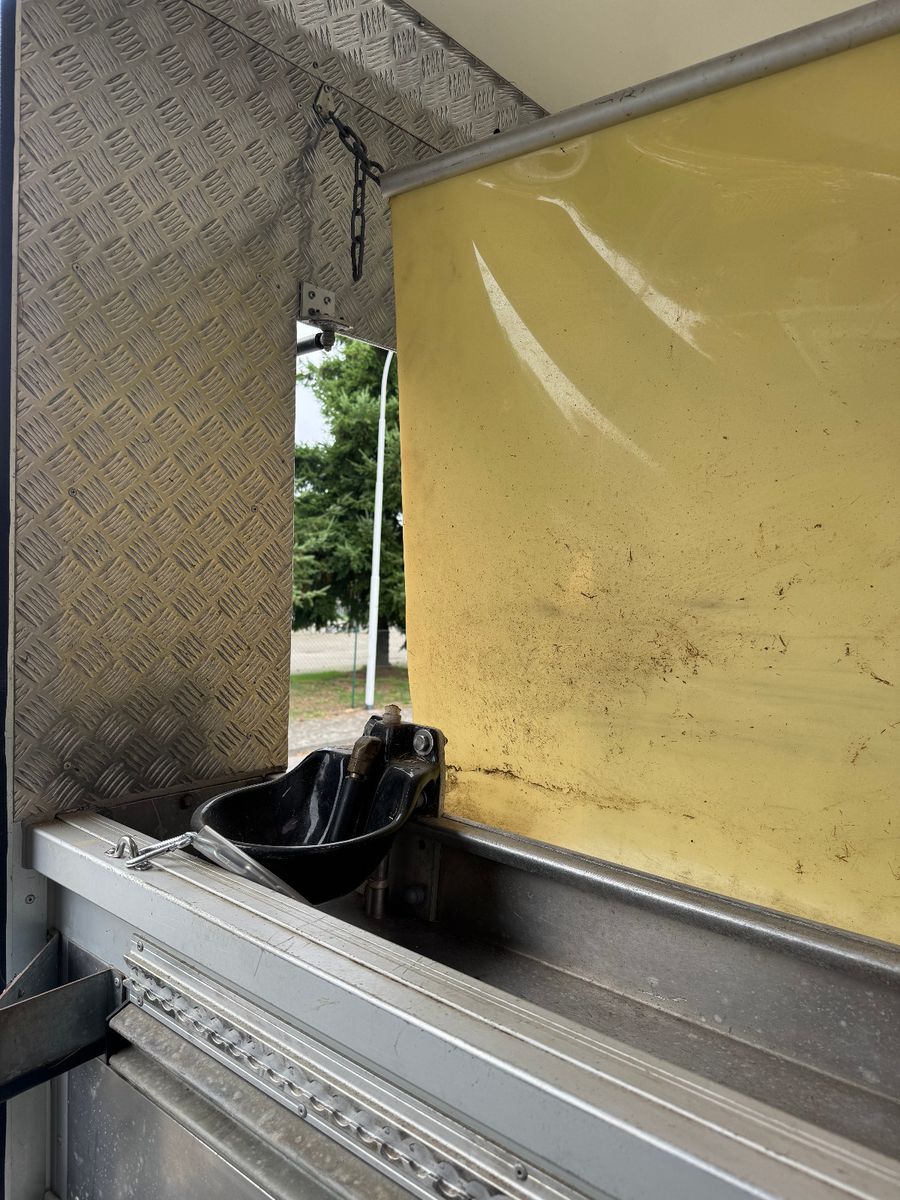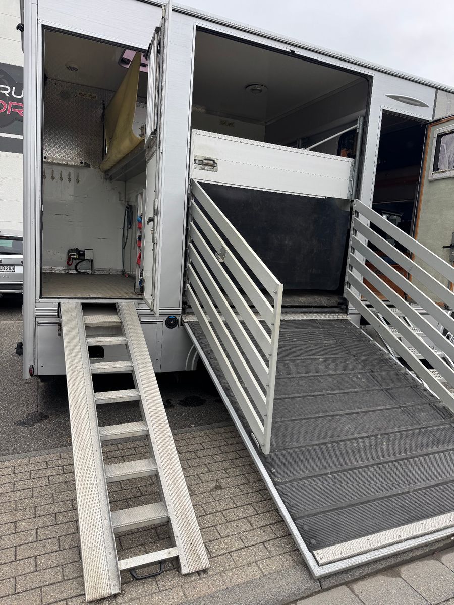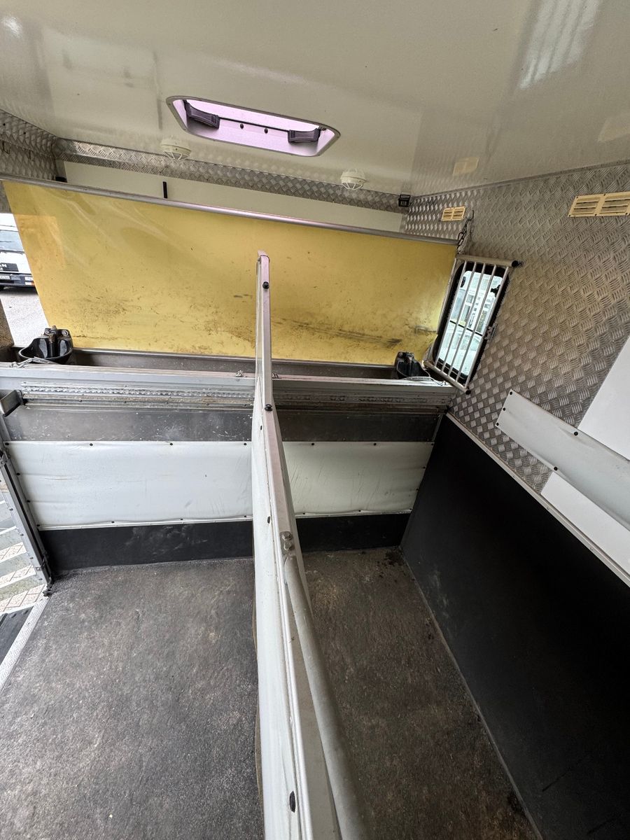 Vollisolierter Koffer mit gutem Isolierwert gegen Hitze und Kälte Seitenrampe mit nachstellbarer Federung Trennwand zwischen den Pferden gepolstert Vollflächig versiegelter Gummiboden Gummischlagschutz Brustwand vor den Pferden mit Ablageplatte mit integriertem Tränksystem (Je Stellplatz 1x Tränke) Wasserabflüsse in der Ablageplatte unter den Tränken integriert Ausnehmbare/beweglichen Trennwände um die ganze Pferdestellfläche zu nutzen Beleuchtung im Pferdeabteil vom Fahrerhaus schaltbar Dachventilator vom Fahrerhaus schaltbar Dachfenster in verschiedenen Positionen zu öffnen, 2x Seitenfenster rechts und links von den Pferdeköpfen, in verschiedenen Positionen zu öffnen Sattelkammer mit zwei Sattelhaltern Ausreichend Trensenhalter Beleuchtung in der Sattelkammer Seilwinde zum einfachen Beladen eines Sattelschrankes Wasserpumpe mit Schlauchanschluss zum Abspritzen der Pferde bei warmen Wetter Regalfächer Gummimatte als Staub- und Schmutzschutz vor den Pferden