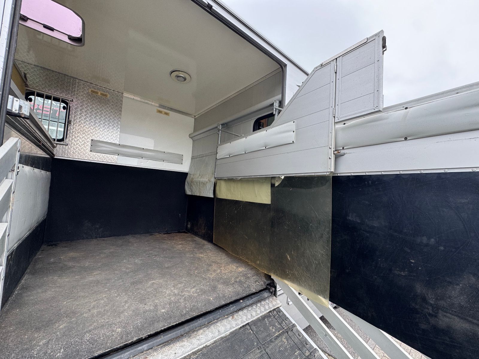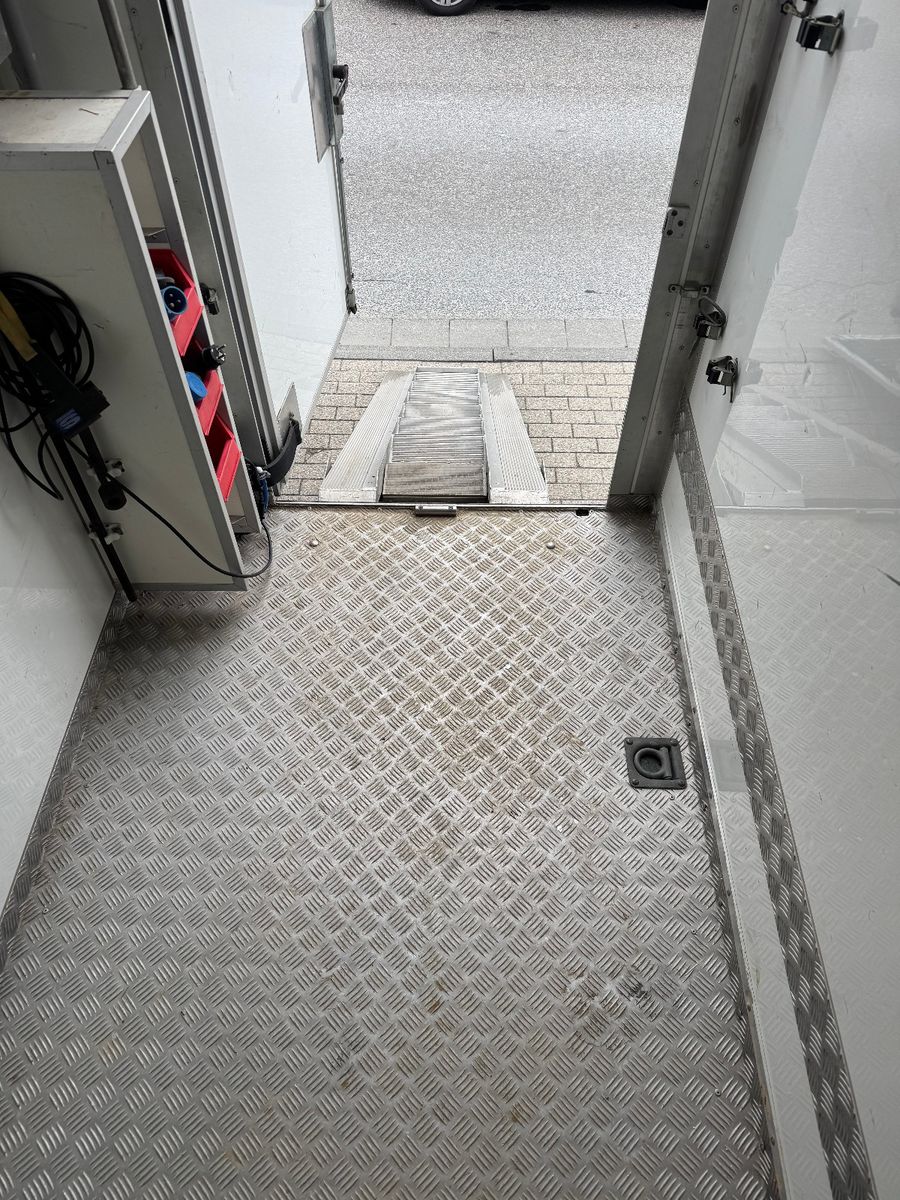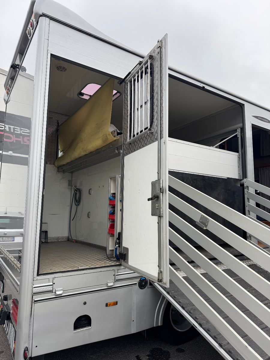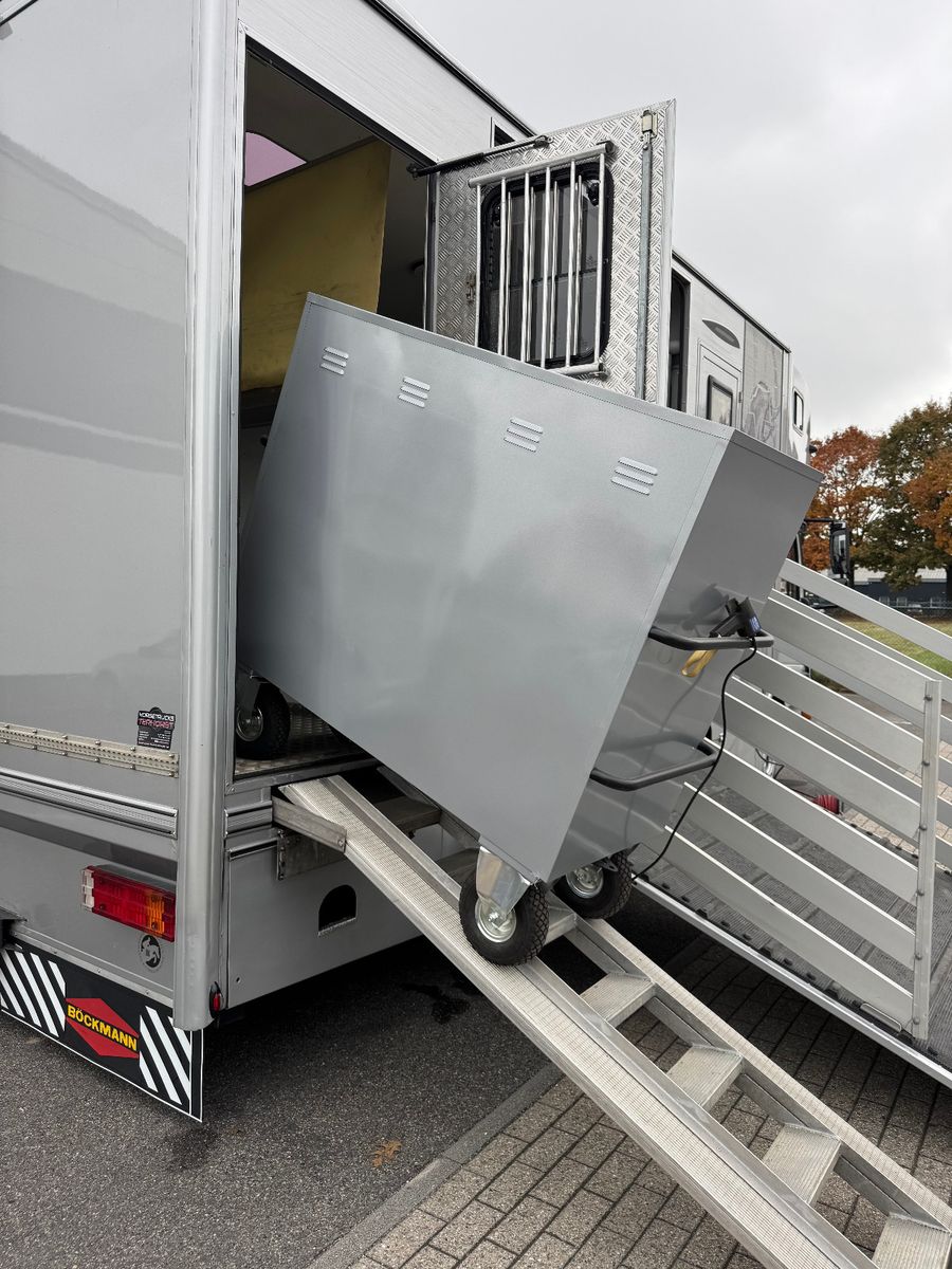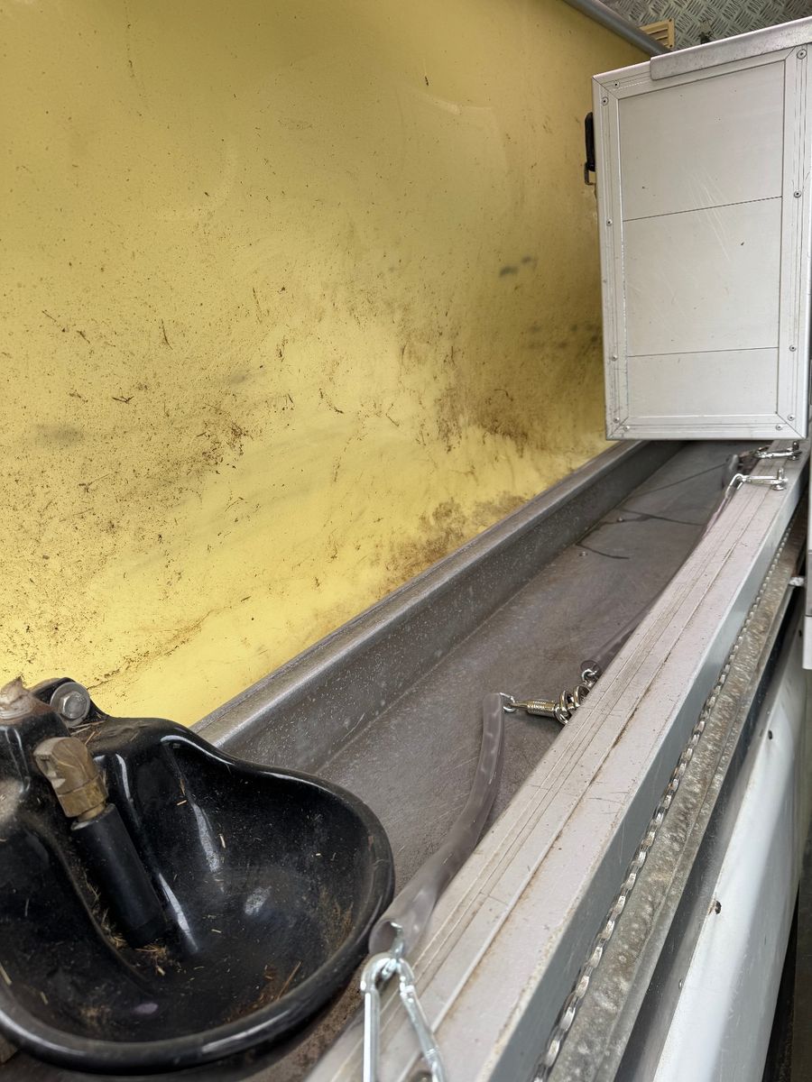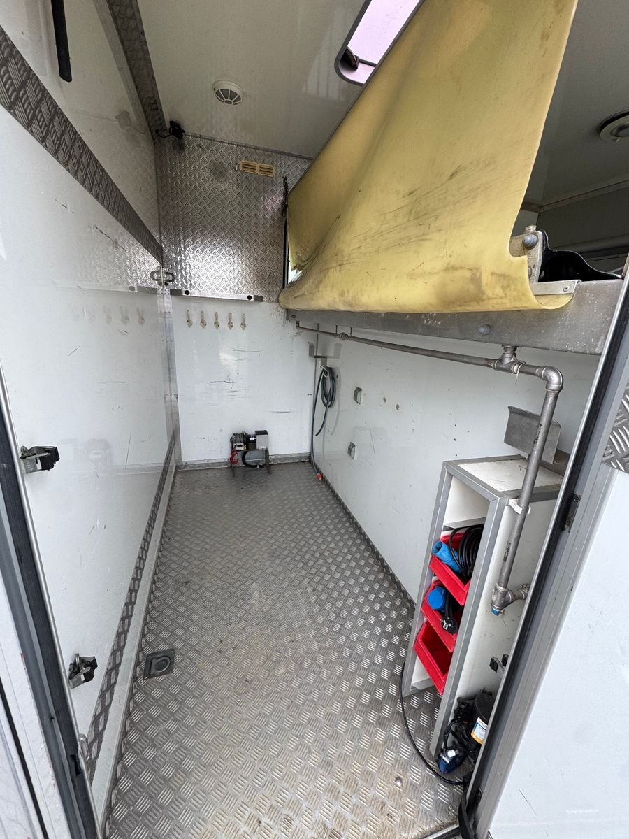 Vollisolierter Koffer mit gutem Isolierwert gegen Hitze und Kälte Seitenrampe mit nachstellbarer Federung Trennwand zwischen den Pferden gepolstert Vollflächig versiegelter Gummiboden Gummischlagschutz Brustwand vor den Pferden mit Ablageplatte mit integriertem Tränksystem (Je Stellplatz 1x Tränke) Wasserabflüsse in der Ablageplatte unter den Tränken integriert Ausnehmbare/beweglichen Trennwände um die ganze Pferdestellfläche zu nutzen Beleuchtung im Pferdeabteil vom Fahrerhaus schaltbar Dachventilator vom Fahrerhaus schaltbar Dachfenster in verschiedenen Positionen zu öffnen, 2x Seitenfenster rechts und links von den Pferdeköpfen, in verschiedenen Positionen zu öffnen Sattelkammer mit zwei Sattelhaltern Ausreichend Trensenhalter Beleuchtung in der Sattelkammer Seilwinde zum einfachen Beladen eines Sattelschrankes Wasserpumpe mit Schlauchanschluss zum Abspritzen der Pferde bei warmen Wetter Regalfächer Gummimatte als Staub- und Schmutzschutz vor den Pferden