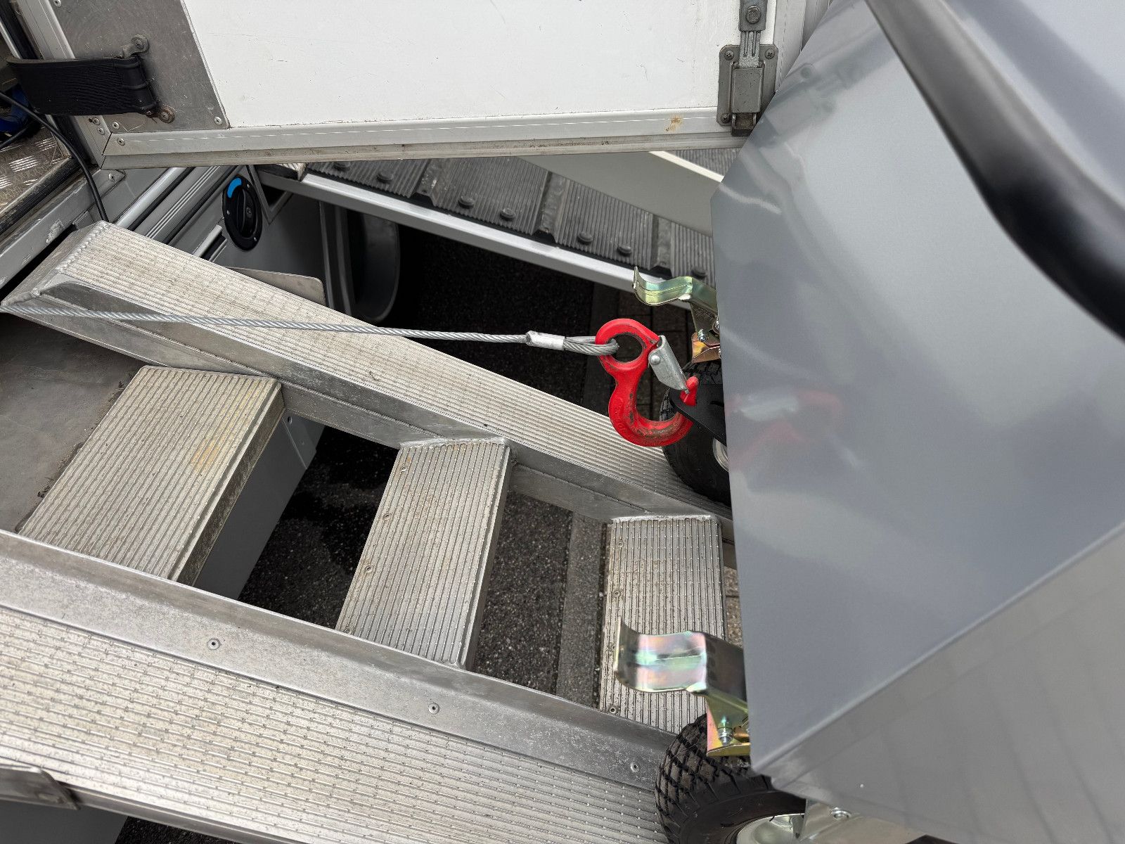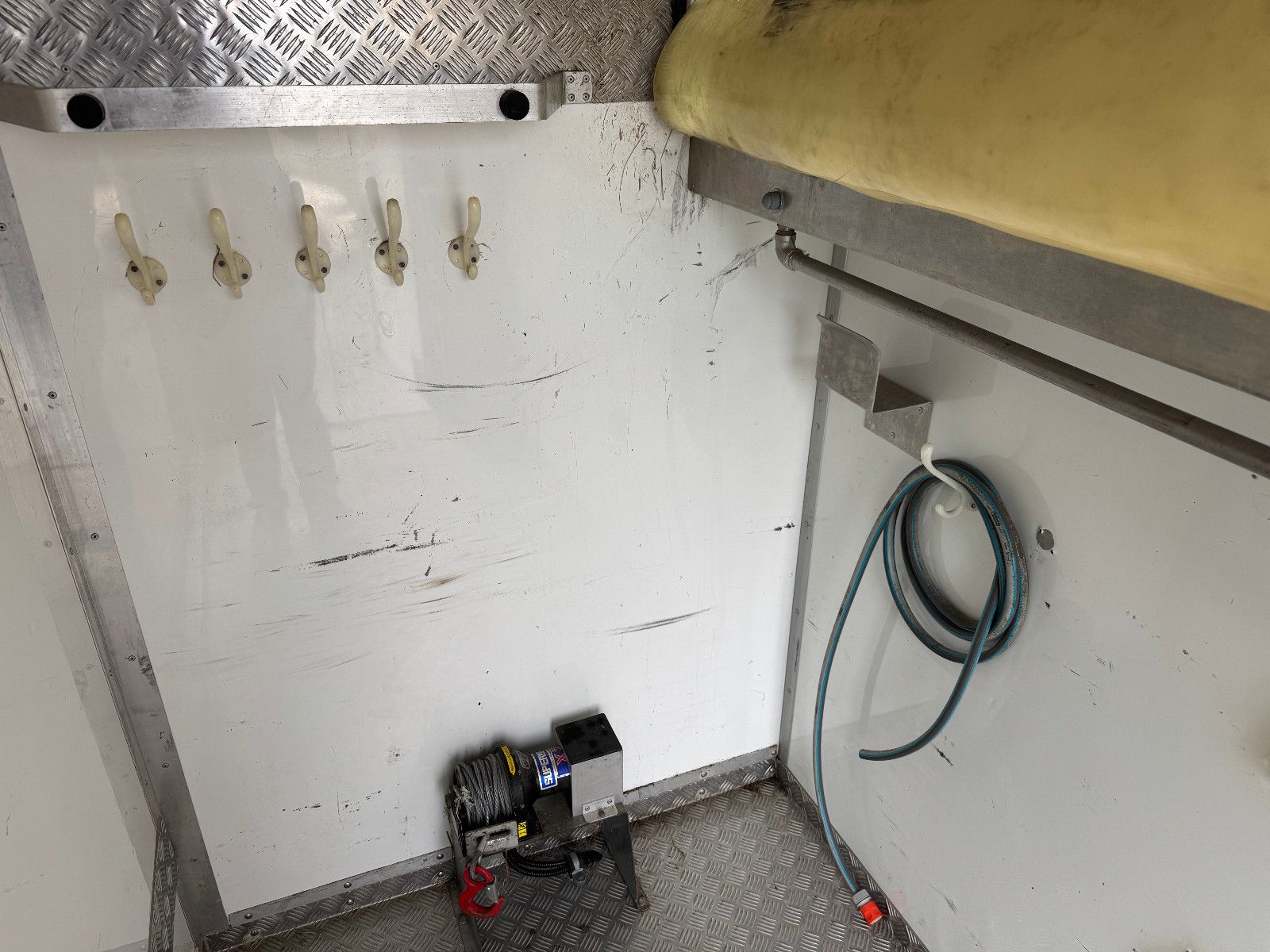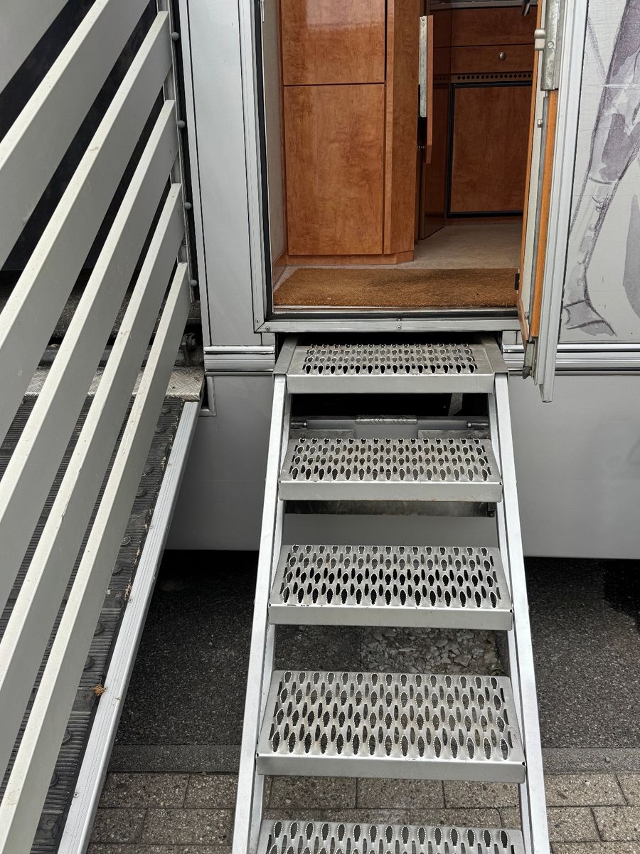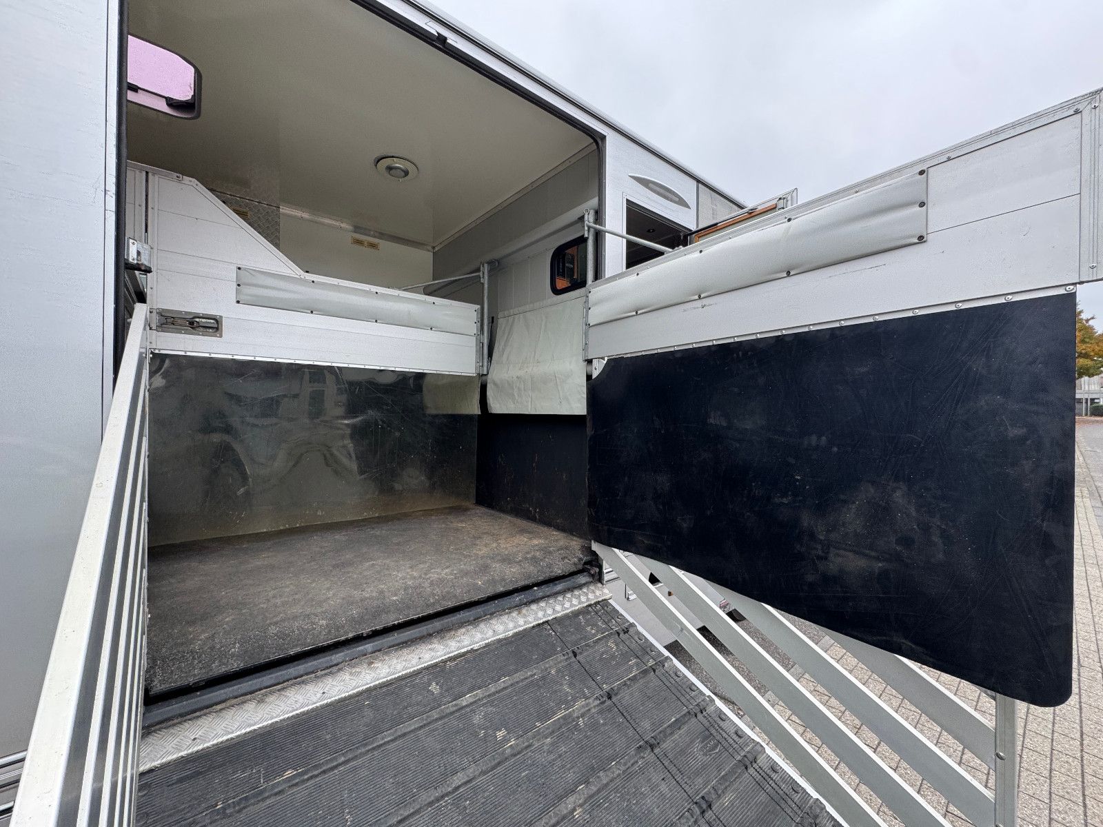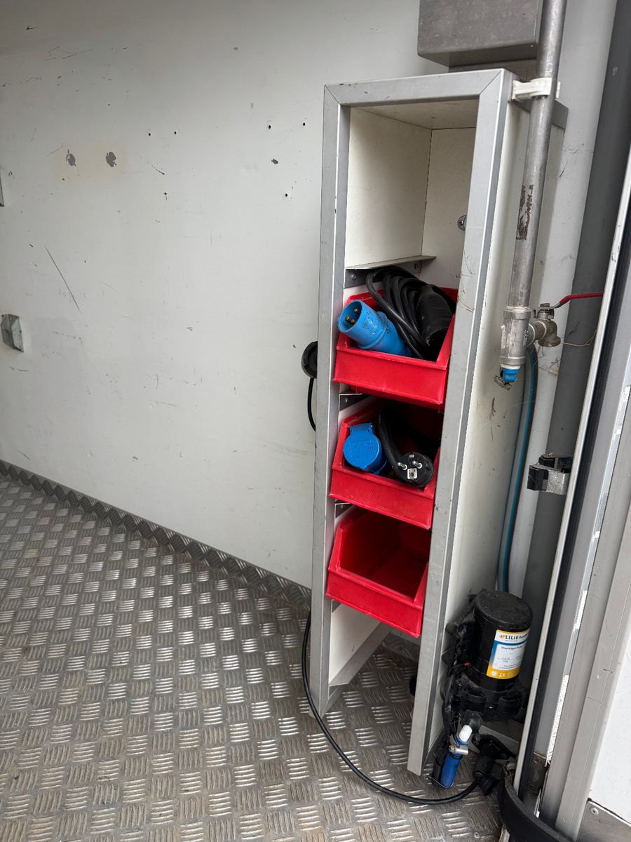 Vollisolierter Koffer mit gutem Isolierwert gegen Hitze und Kälte Seitenrampe mit nachstellbarer Federung Trennwand zwischen den Pferden gepolstert Vollflächig versiegelter Gummiboden Gummischlagschutz Brustwand vor den Pferden mit Ablageplatte mit integriertem Tränksystem (Je Stellplatz 1x Tränke) Wasserabflüsse in der Ablageplatte unter den Tränken integriert Ausnehmbare/beweglichen Trennwände um die ganze Pferdestellfläche zu nutzen Beleuchtung im Pferdeabteil vom Fahrerhaus schaltbar Dachventilator vom Fahrerhaus schaltbar Dachfenster in verschiedenen Positionen zu öffnen, 2x Seitenfenster rechts und links von den Pferdeköpfen, in verschiedenen Positionen zu öffnen Sattelkammer mit zwei Sattelhaltern Ausreichend Trensenhalter Beleuchtung in der Sattelkammer Seilwinde zum einfachen Beladen eines Sattelschrankes Wasserpumpe mit Schlauchanschluss zum Abspritzen der Pferde bei warmen Wetter Regalfächer Gummimatte als Staub- und Schmutzschutz vor den Pferden