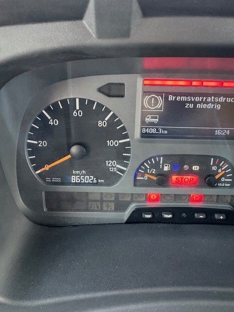 A70 Differentialsperre Vorderachse AL3 Vorderachse 7,5 t AM3 Hinterachse H7 13,0 t Tellerrad 300 AR1 Achsübersetzung i = 5,333 (HL7) B02 Antiblockiersystem (ABS) B43 Anhängerbremse 2-Leitung BB6 Trommelbremse an VA und HA BB9 Rohrbruchsicherung für Bremsanlage C42 Stabilisator, Hinterachse, unter Rahmen C63 Stoßstange Stahlausführung CL9 Lenkung LS 6/LS 8 CR5 Rahmenkopf verstärkt, für Sonderanbauten CU0 Unterfahrschutz klappbar, hinten (Meiller) D15 Dachluke, schwenkbar D17 Drehgestell E10 Tarnlichtkreis E84 Batteriekasten, abschließbar Trennschalter für Batterie ES8 Zusatzsteckdose 24 V/15 A, Fahrerhaus-Brüstung F20 S-Fahrerhaus, 180 mm verlängert FE5 Fensterheber elektrisch, Fahrer- und Beifahrertür FL3 Fahrerhauslagerung, hinten verstärkt FL6 Fahrerhauslagerung, standard FN1 Verteiler-Cockpit FQ7 Ablage über Windschutzscheibe, 2 Fächer FS9 Außenspiegel, elektrisch, Fahrerseite FX7 Frontspiegel aerodynamisch, vorne GS3 Getriebeschaltung, hydraulisch GT1 Getriebe G 131-9/14,57-1,0 GV3 Verteilergetriebe VG1400 - 3W H03 Klimaanlage H04 Wärmeisolierung, zusätzlich HF2 Pollenfilter HH1 Warmwasser-Zusatzheizung, Eberspächer D5W S I40 Reifen 14.00 R 20 VA/NLA I41 Reifen 14.00 R 20 HA IA1 Radformel 4x4 ID1 Blattfederung IQ8 Radstand 4200 mm IV0 18,0-Tonner IX5 Reihenmotor, 6 Zylinder IY2 Hydraulik-Fluid, Pentosin CHF 11 S JD3 Tachograf, dig. EG,Drehzahlschr. + Zusatzrec.,ADR JK3 Kombi-Instrument, grafikfähiges Display, Ökometer KAL3 Vorderachse 7,5 t KESM Fremdstart / Kraftsteckdose 2 polig (STANAG) KH8 Auspufftopf, Endrohr nach unten KH9 Auspuffanlage, nach hinten versetzt KP2 AdBlue-Tank, 35 l KP9 AdBlue-Behälter, Kunststoff KS2 Haupttank 300 l, Stahl KTM0 Gewichtsvariante 16,5 t (7,5/9,0) L30 Steinschlag-Schutzgitter, Scheinwerfer L72 Elektrik, für Fremdaufbau M49 Tandem-Luftfilteranlage M89 Flammanlage MD9 Tempomat MQ8 Motor, R6, LA, 210 kW (286 PS), 2200/min MS4 BlueTec 4 (Euro IV) N05 Nebenantrieb Vorgelegewelle MB, 2c N80 Getriebesperre für Nebenantrieb NZ1 Nebenabtrieb, einfach QC8 Vorderfeder, 7,5 t, asymmetrisch QE9 Hinterfeder, 13,0 t, hart R82 Schrägschulterfelgen 10.00-20, Einzelbereifung S28 Mittelsitz, mit Sicherheitsgurt SG2 Beifahrer-Standard-Schwingsitz, Isringhausen SG5 Fahrer-Standard-Schwingsitz, Isringhausen TM0 Gewichtsvariante 16,5 t (7,5/9,0) Reifenprofil: 1. Achse 7mm 2. Achse 13mm Druckluftkessel bereits in Rahmen verlegt