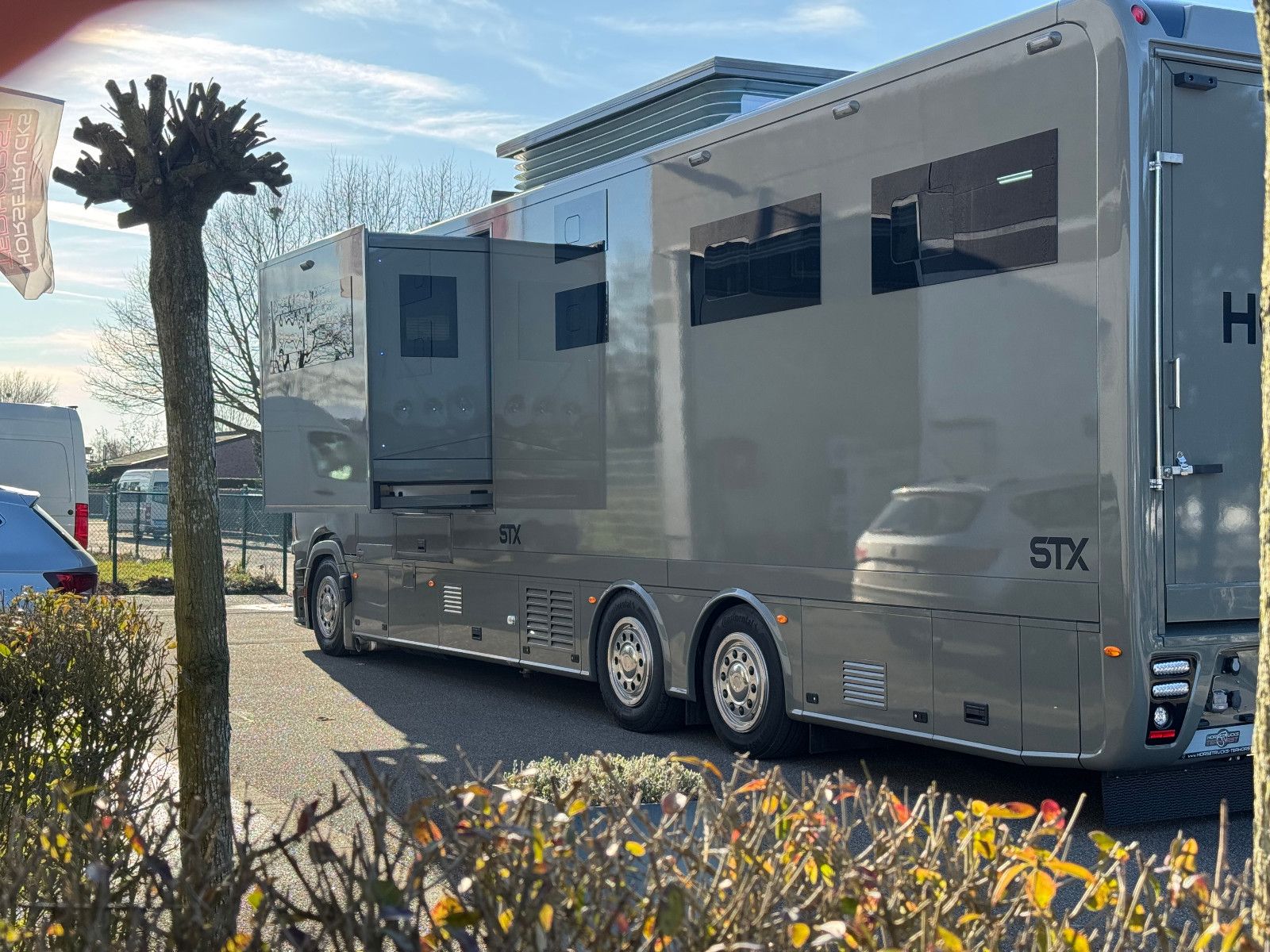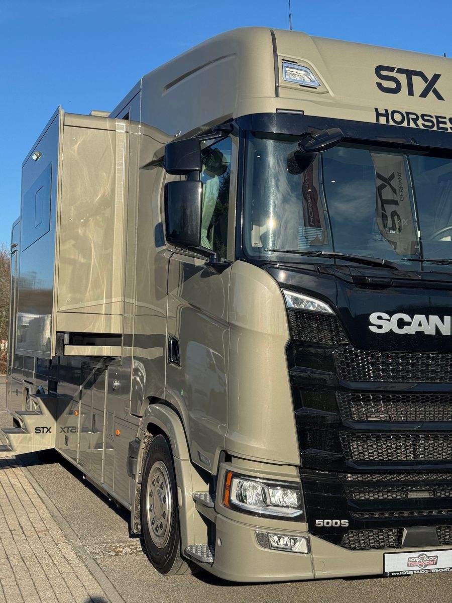 LUXUS STX Scania S500 für 4-5 Pferde mit Doppel Pop-Out & Mega Push-Up für Extra großes und geräumiges Bett über dem Bad