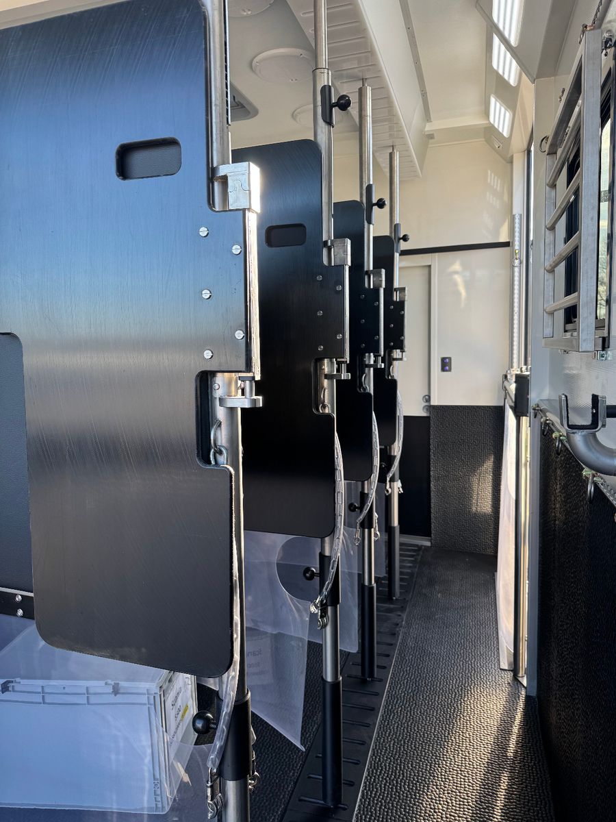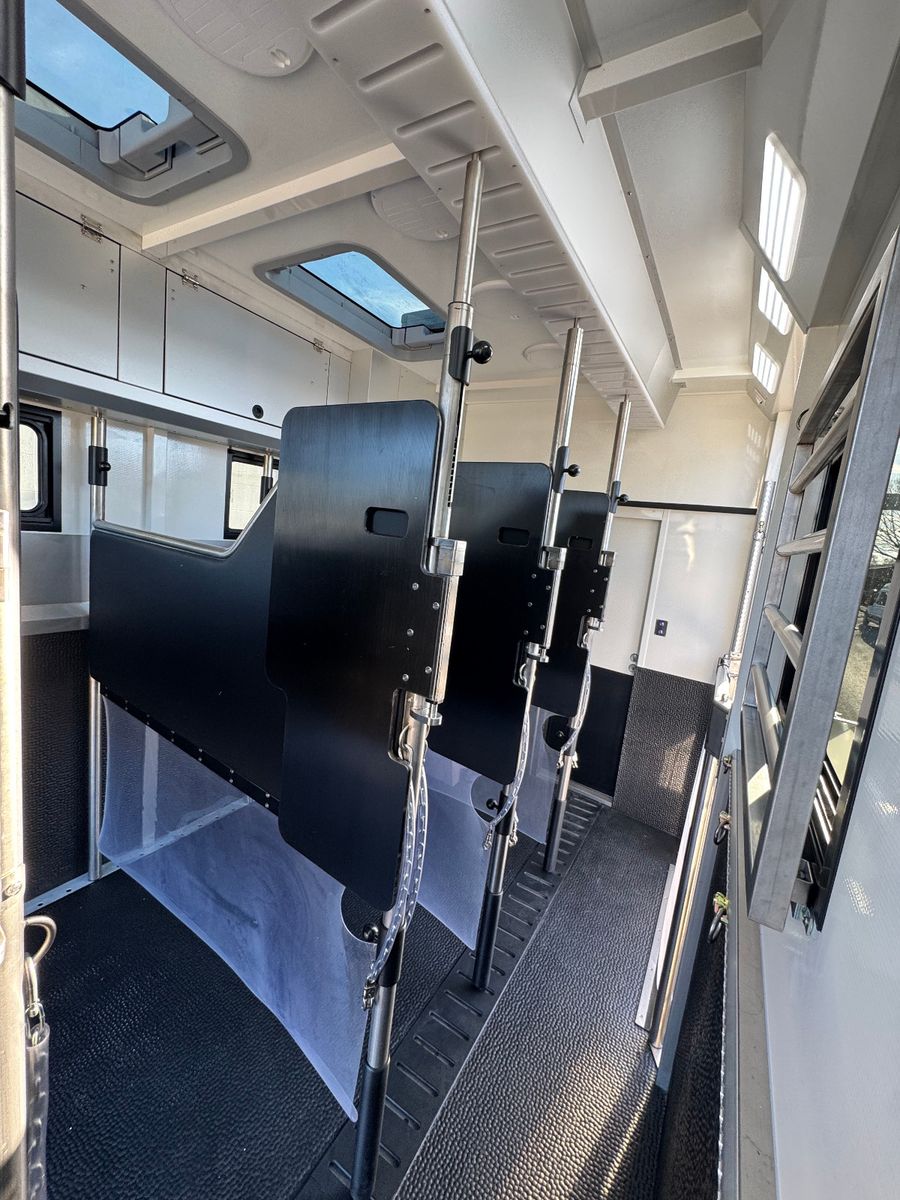 4-5 Pferde (Stellplätze) STX Trennwände mit klappbarer Kopftrennung 2x Knick-Trennwände mit Polsterung & Hengsttrennungen außen unter dem 2. Pop-Out Sattelschrank mit Liftfunktion Heck- & Seitenrampe mit Rampenbegrenzer im neuen STX Design Neue Rampenfederung für Kinderleichtes Öffnen/schließen der großen Rampen Ultra stabiler Gummiboden Kamera-Überwachung der Pferde LED Tag-Nacht Licht Digitale Temperaturüberwachung Bremslichtfunktion verschließbare Deckenablagen hinter den Pferden mehrere Dachfenster zahlreiche Dachventilatoren Grosse Schublade seitlich am Heck als Staufach anstatt der seitlichen Sattelkamer --> Sogt für mehr Platz im Pferdebereich, da die Sattelkammer hinten nicht ins Pferdeabteil reicht Extra Seilwinde für zustl. Turnierkiste und einfacheres Verladen dieser