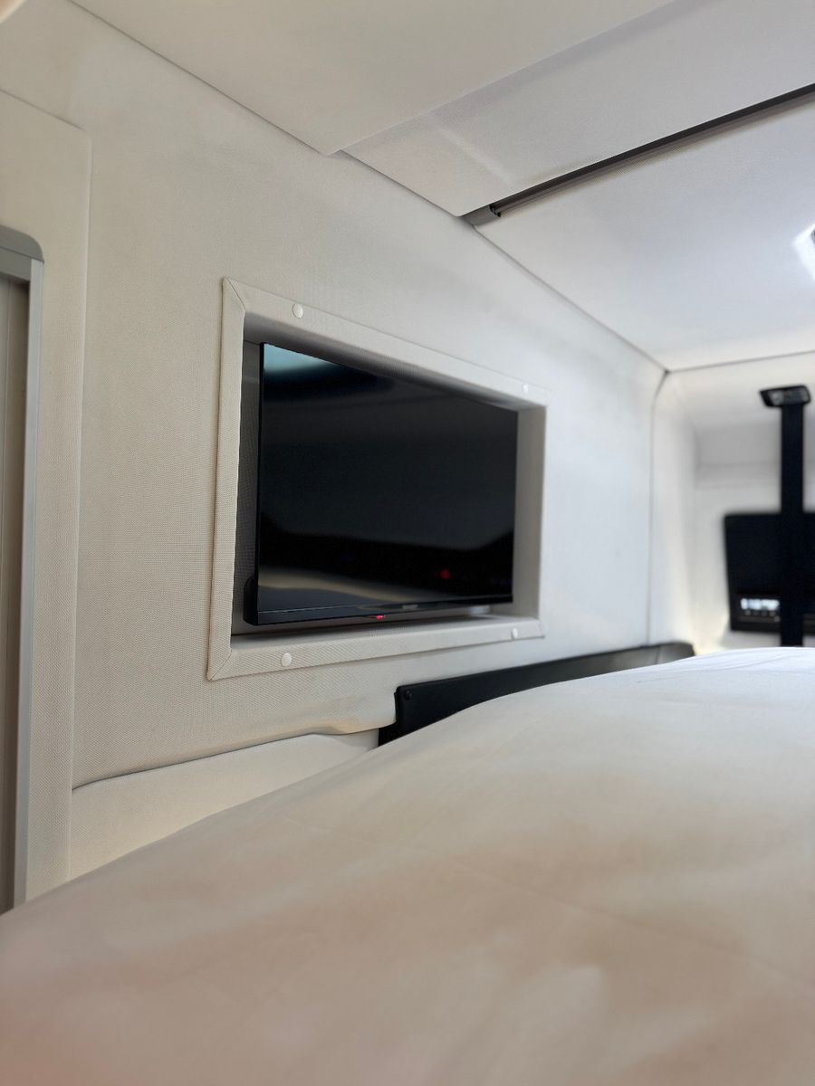 Pop-Out mit U-Sitzgruppe (einfach umbaubar zum Schlafplatz) 2. Popout mit Küchenzeile Push-Up mit extra großen Schlafplatz über dem Badezimmer Extra TV im Schlafplatz mit Push-Up verbunden mit Apple TV XL Schlafplatz über Fahrerabteil (Bett mit brandneuer und robuster Liftftechnologie) Samsung TV als Haupt-TV im Wohnabteil verbunden mit Apple TV Bose Soundbar (auch mit Bluethooth connect zum Abspielen von Musik) leistungsstarke Klimaanlage leistungsstarke Diesel Webasto Standheizung großes Onan Stromaggregat Dusche mit Wasser WC Komplett ausgestatte Küche inkl. Backofen Kühlschrank mit Gefrierfach Wohnung unterkellert für viel Stauraum