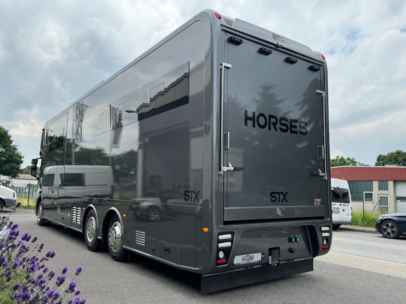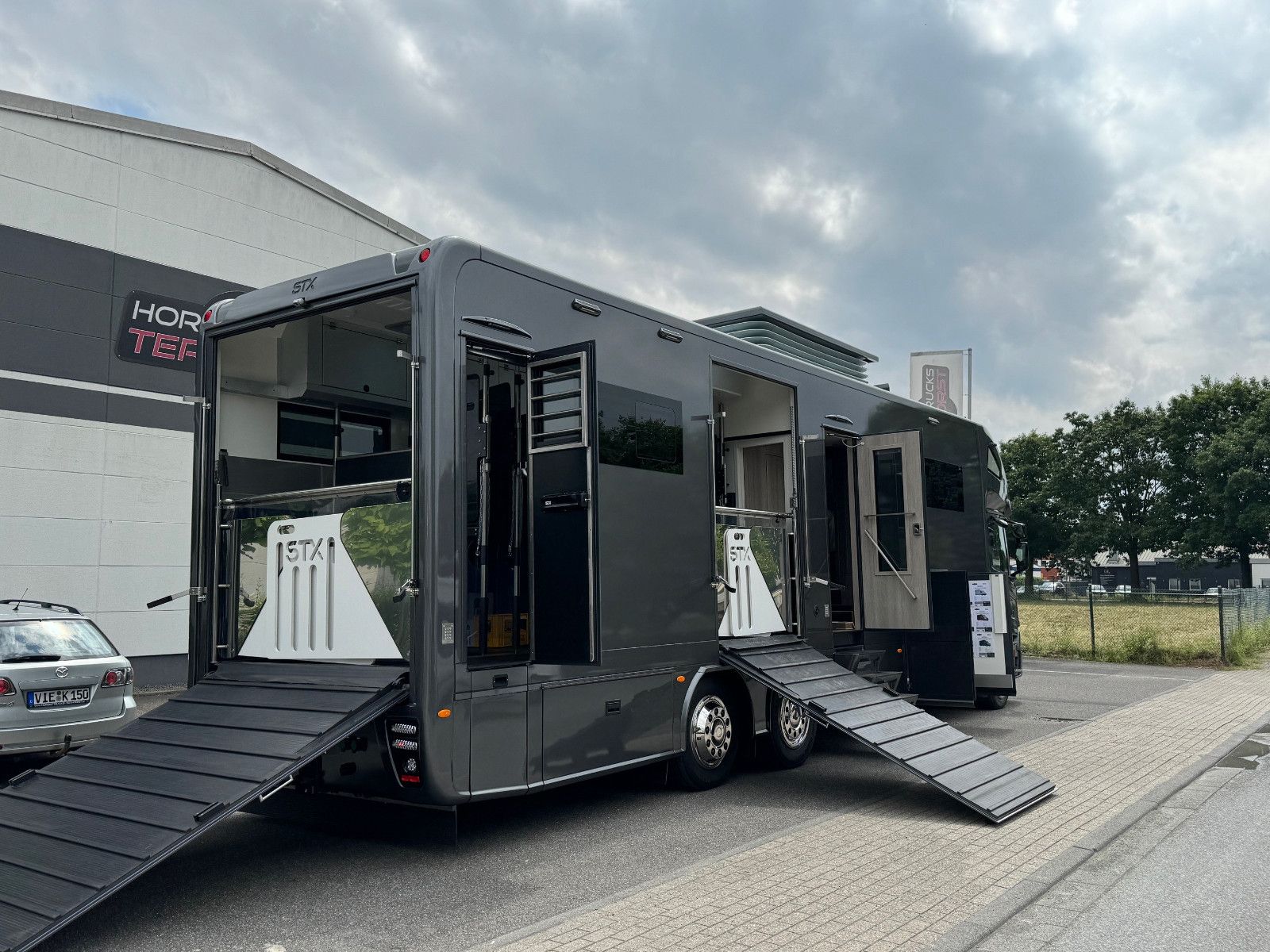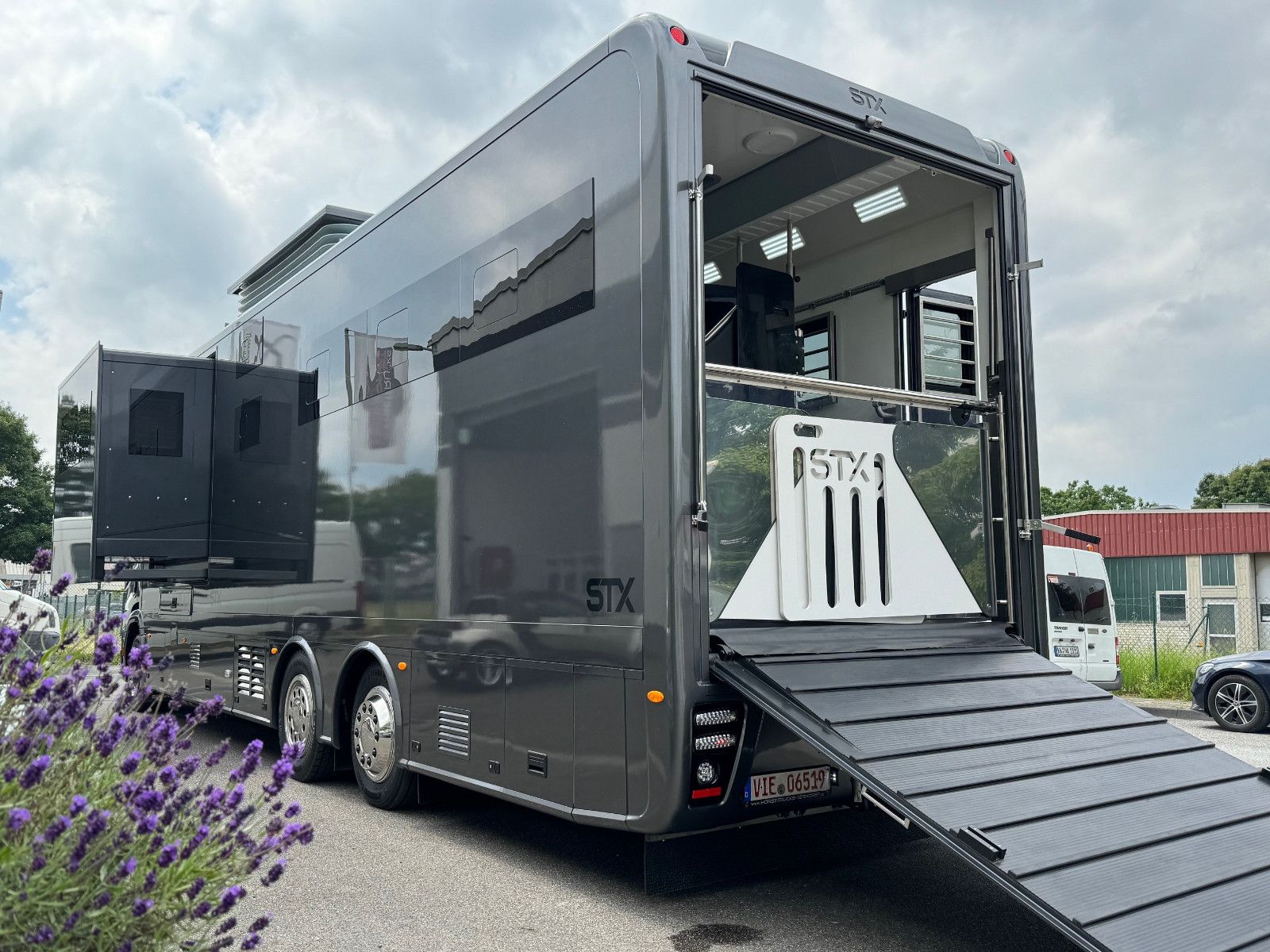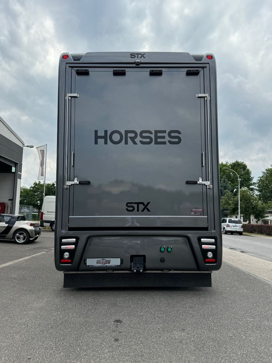 5-6 Pferde (Stellplätze) STX Trennwände mit klappbarer Kopftrennung 2x Knick-Trennwände mit Polsterung & Hengsttrennungen großer Sattelschrank mit Liftfunktion Heck- & Seitenrampe mit Rampenbegrenzer im neuen STX Design Neue Rampenfederung für Kinderleichtes Öffnen/schließen der großen Rampen Softgummiboden Kamera-Überwachung der Pferde LED Tag-Nacht Licht Digitale Temperaturüberwachung Bremslichtfunktion Deckenablagen hinter den Pferden mehrere Dachfenster Dachventilatoren Grosse Schublade seitlich am Heck als Staufach anstatt der seitlichen Sattelkamer --> Sogt für mehr Platz im Pferdebereich, da die Sattelkammer hinten nicht ins Pferdeabteil weicht Extra Seilwinde für zustl. Turnierkiste und einfacheres Verladen der Kiste