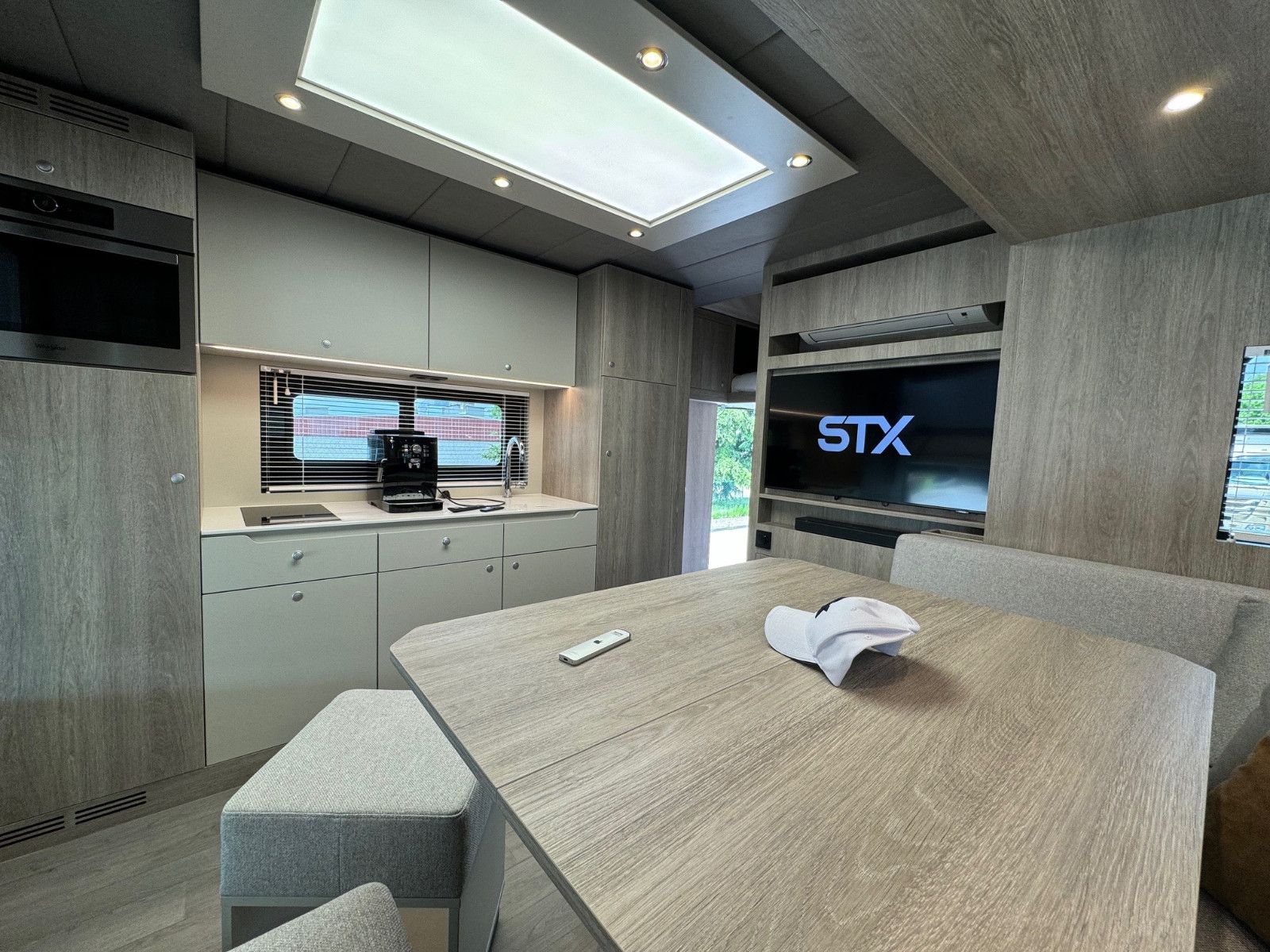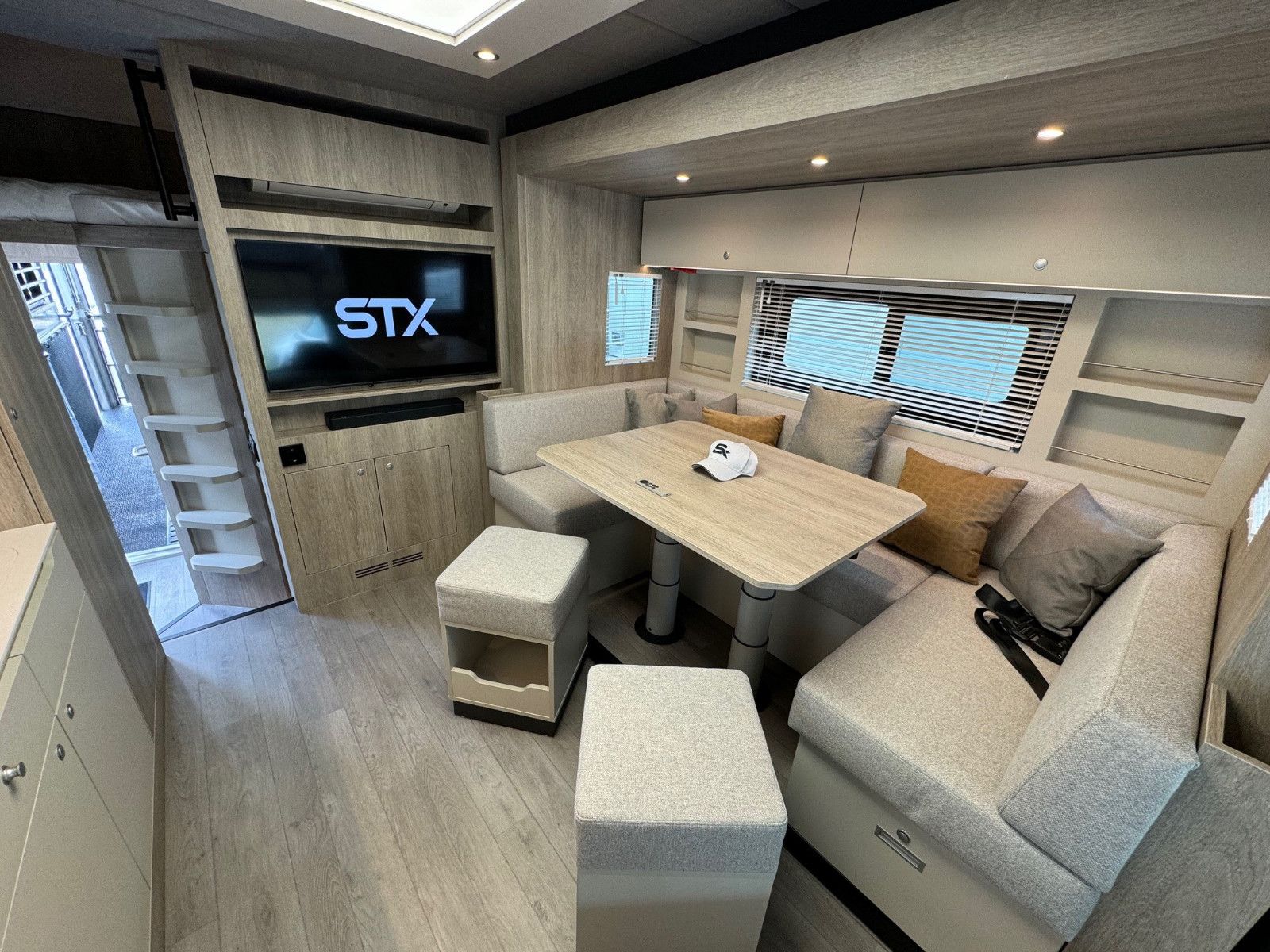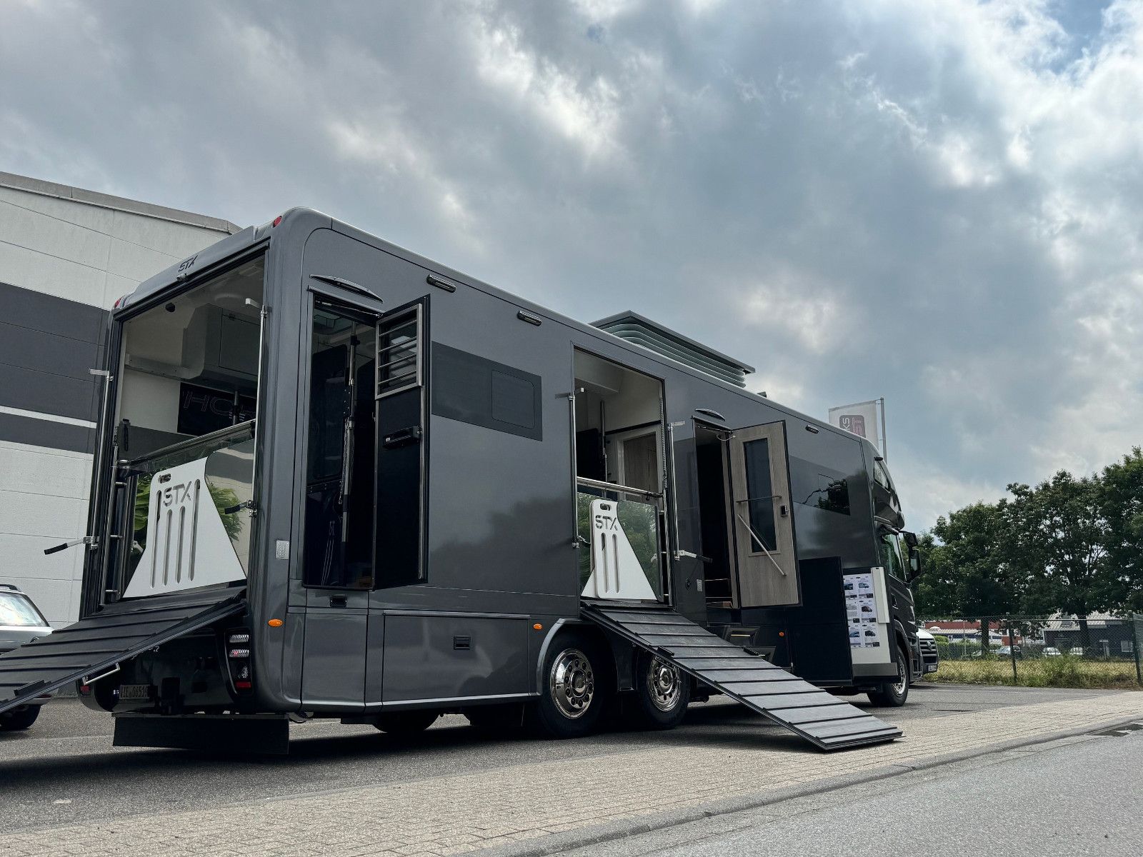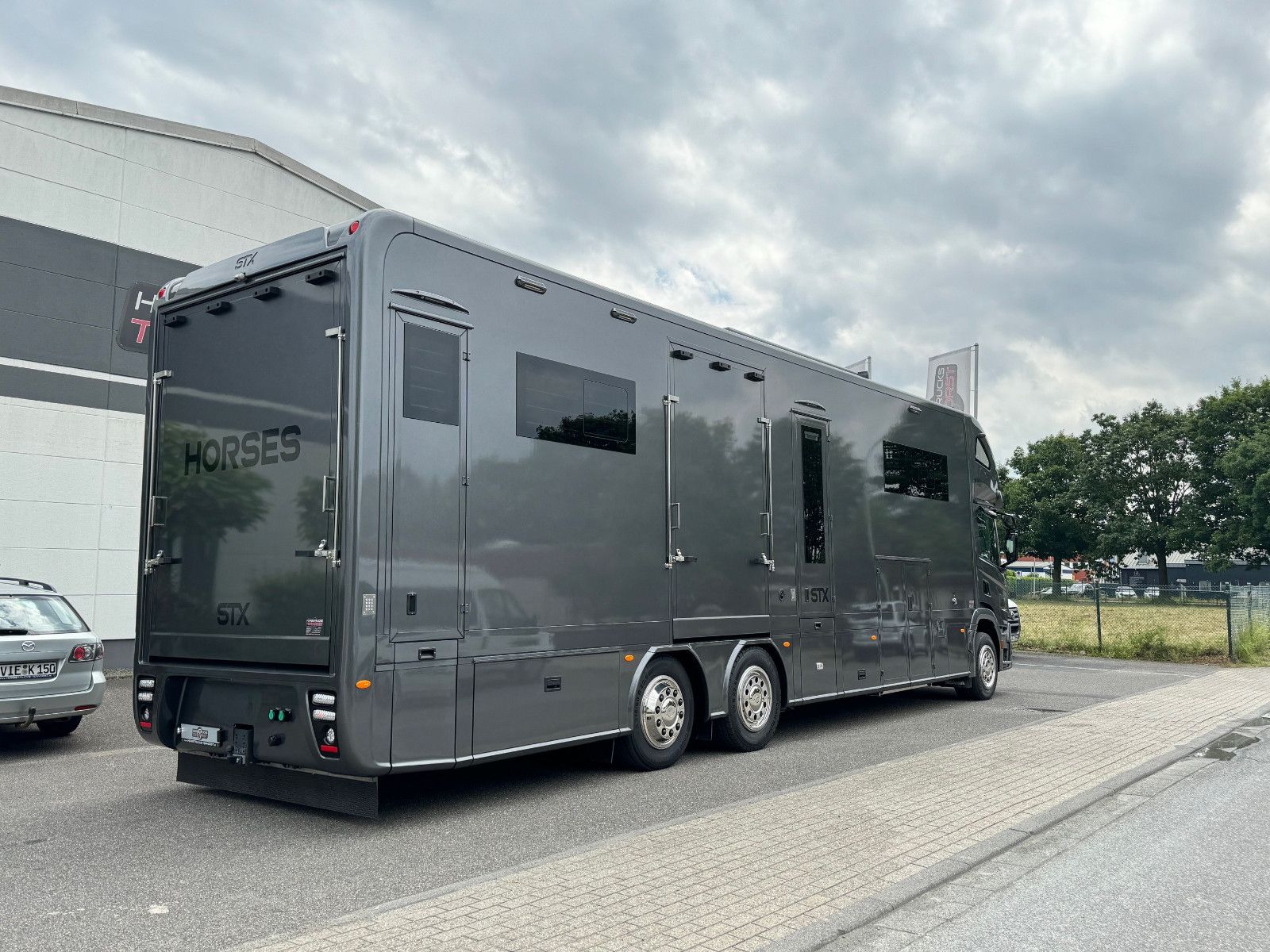 5-6 Pferde (Stellplätze) STX Trennwände mit klappbarer Kopftrennung 2x Knick-Trennwände mit Polsterung & Hengsttrennungen großer Sattelschrank mit Liftfunktion Heck- & Seitenrampe mit Rampenbegrenzer im neuen STX Design Neue Rampenfederung für Kinderleichtes Öffnen/schließen der großen Rampen Softgummiboden Kamera-Überwachung der Pferde LED Tag-Nacht Licht Digitale Temperaturüberwachung Bremslichtfunktion Deckenablagen hinter den Pferden mehrere Dachfenster Dachventilatoren Grosse Schublade seitlich am Heck als Staufach anstatt der seitlichen Sattelkamer --> Sogt für mehr Platz im Pferdebereich, da die Sattelkammer hinten nicht ins Pferdeabteil weicht Extra Seilwinde für zustl. Turnierkiste und einfacheres Verladen der Kiste