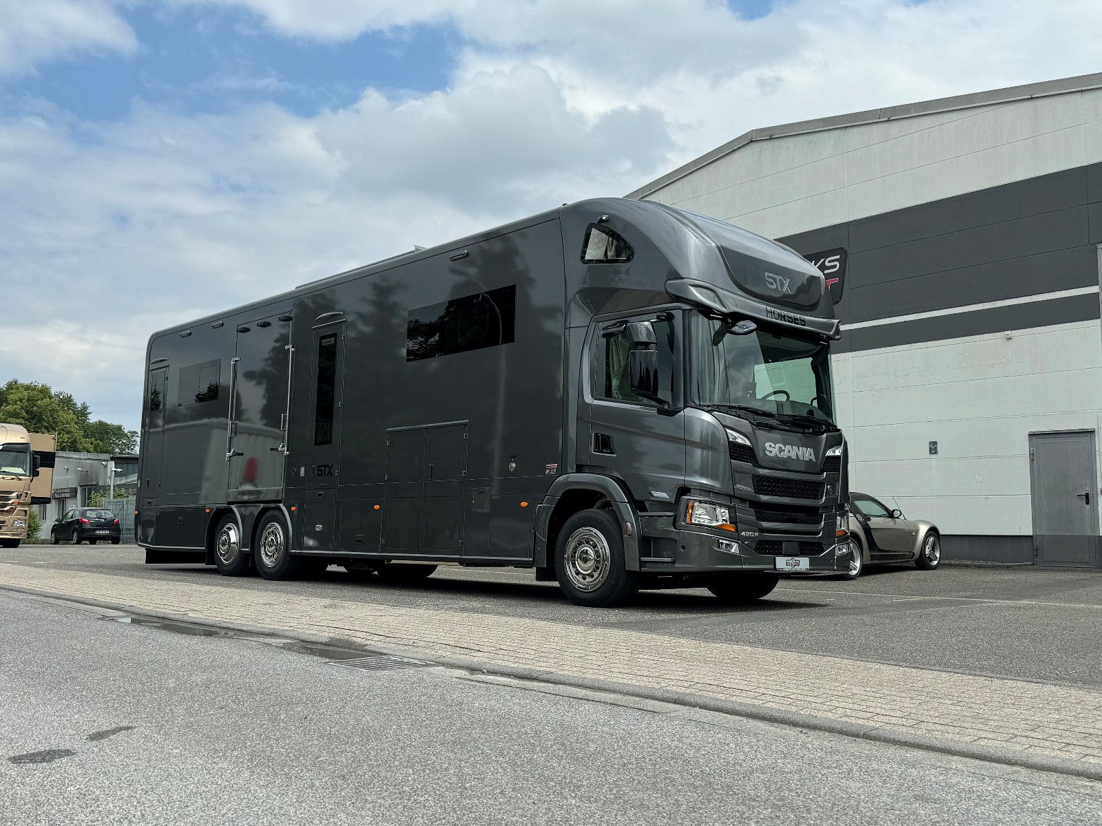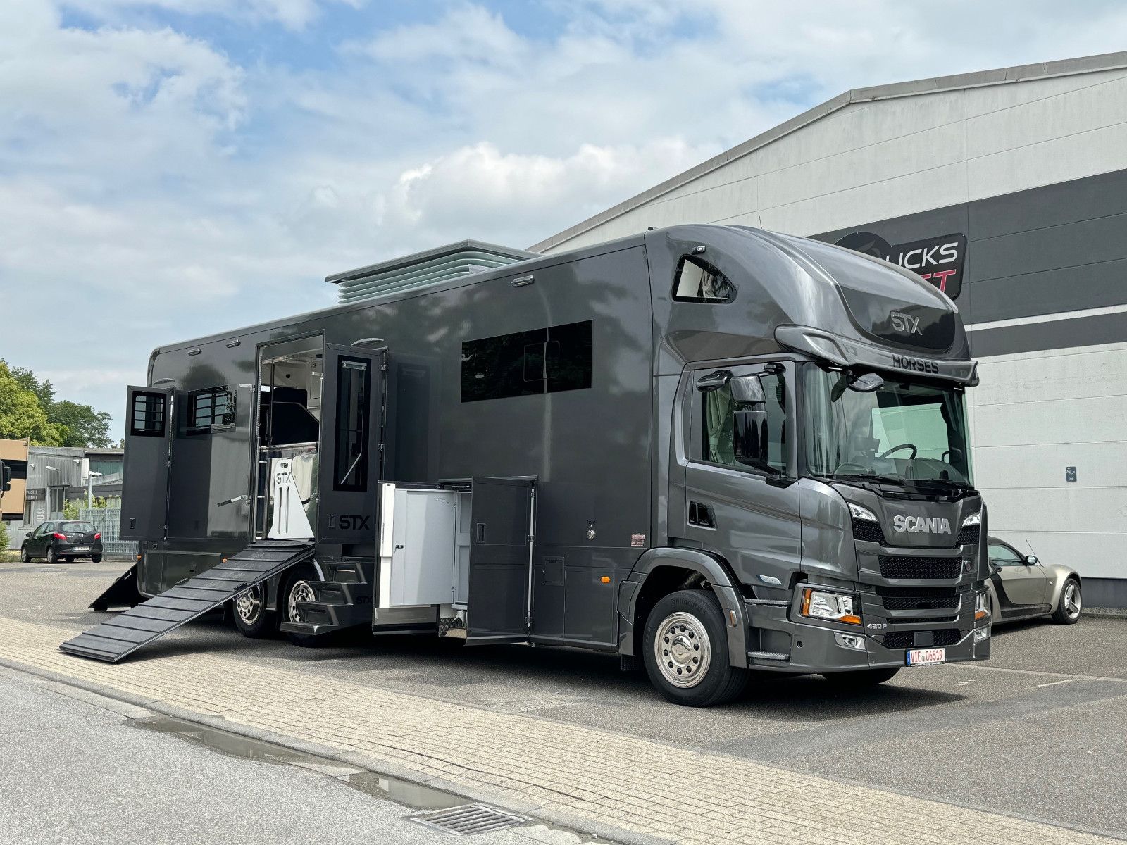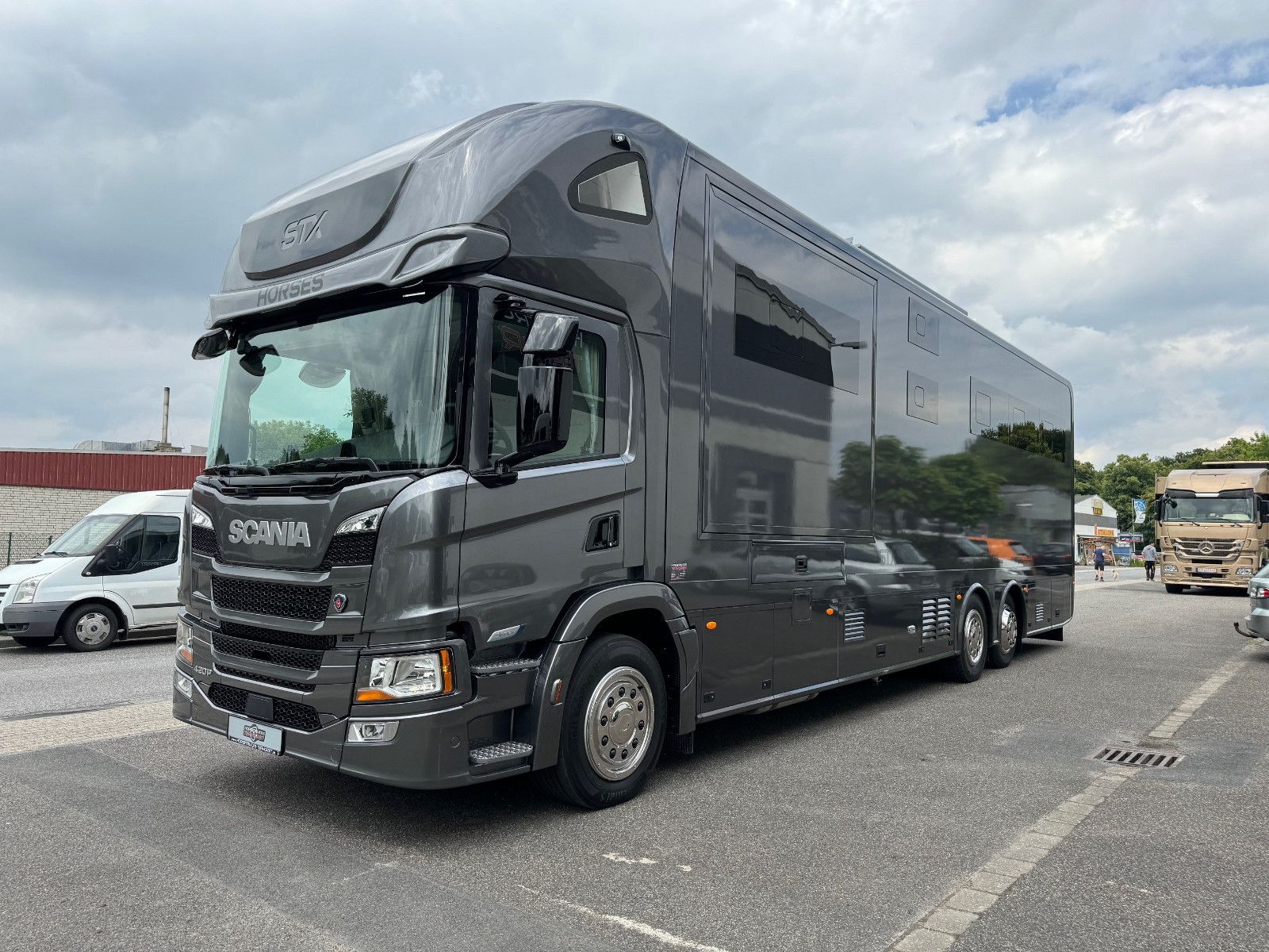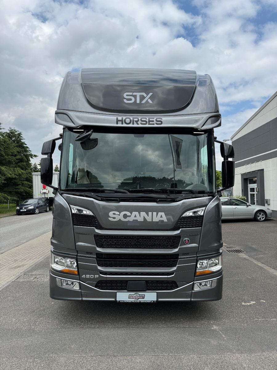 Scania P 420 EURO 6 Scania-Front und STX-Sticker in der Farbe MB Brilliant Silber 6 eingetragene Sitzplätze Digitale Temperaturüberwachung im Pferdeabteil Tempomat Vollautomatikgetriebe 3-Achser mit Lenkachse Klimaautomatik Multifunktionslenkrad Navigationssystem Bluetooth Freisprech-Anlage Luftfederung Rückfahr- und Pferdeüberwachungskamera Radio / CD / MP3 / App-Connect Anhängerkupplung zugmaul Rockinger Anhängerkupplung Kugelkopf (3,5t)